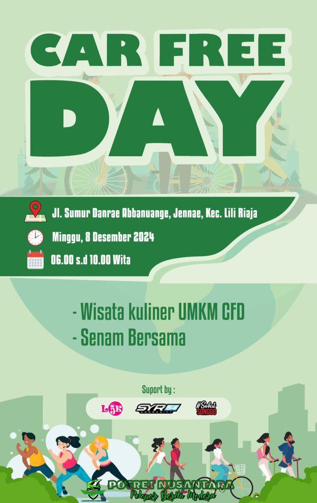 Soppeng,-Potretnusantara.co.id– Untuk pertama kalinya, Car Free Day (CFD) digelar di Jalan Sumur Danrae Abbanuange, Kelurahan Jennae, Kecamatan Liliriaja, pada Minggu pagi, mulai pukul 06.00 WITA hingga 10.00 WITA. Kegiatan ini disambut antusias oleh masyarakat setempat, yang menikmati suasana bebas kendaraan dan berbagai acara menarik.