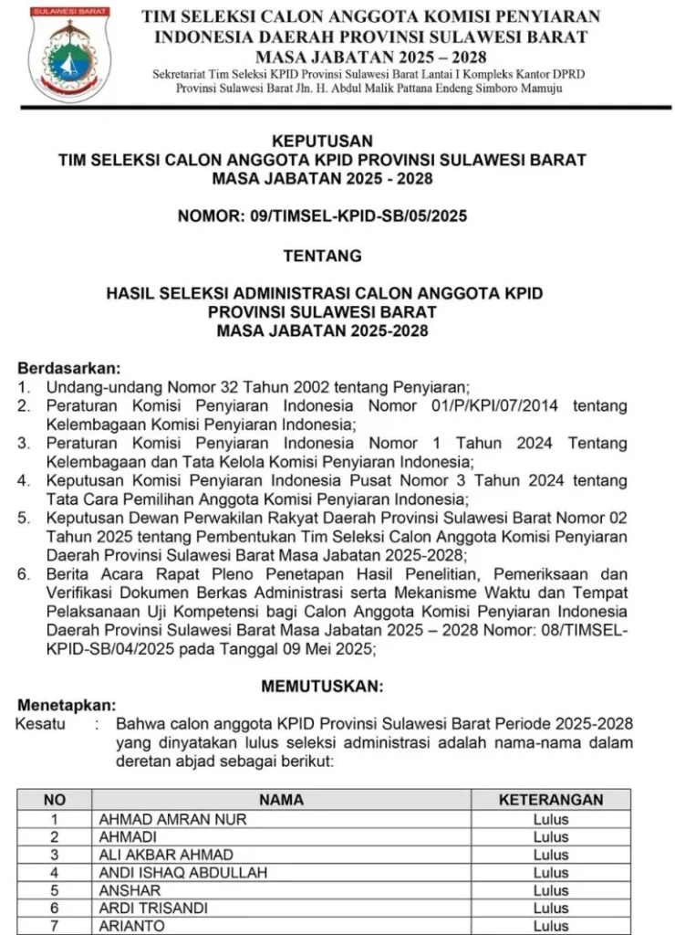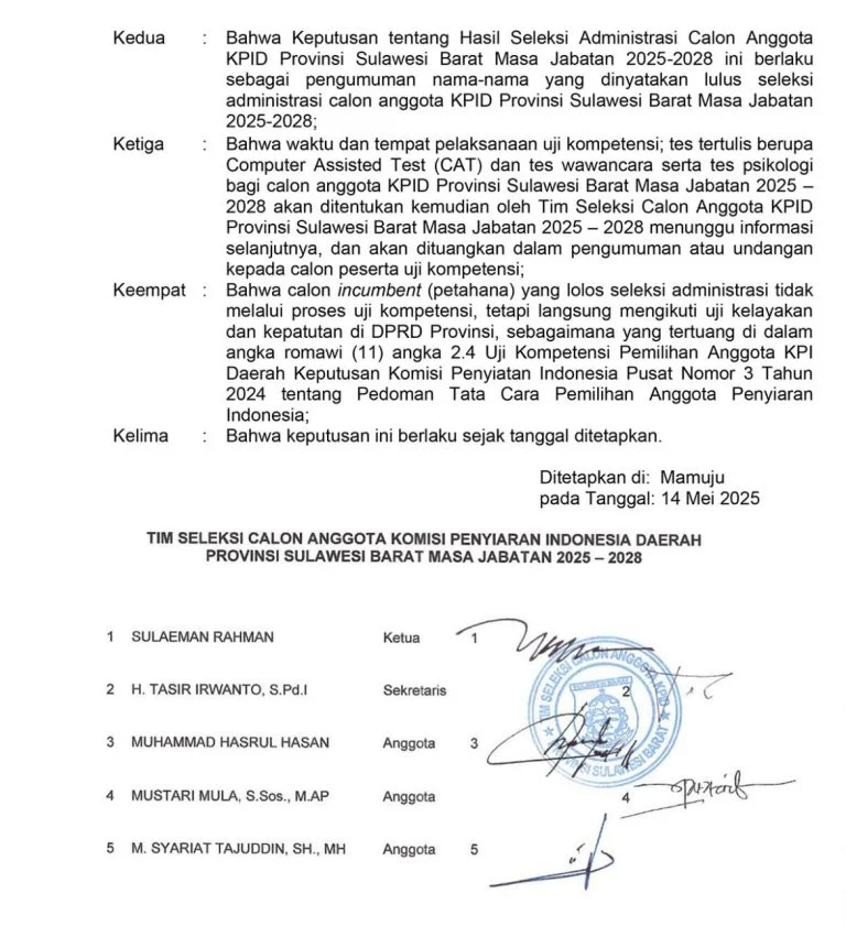 Beranda Peristiwa Pengumuman Hasil Seleksi Administrasi Calon Anggota KPID Provinsi Sulawesi Barat Masa Jabatan 2025-2028 PeristiwaPengumuman Hasil Seleksi Administrasi Calon Anggota KPID Provinsi Sulawesi Barat Masa Jabatan 2025-2028(#)0 min baca15 Mei 202515 Mei 2025×Pengumuman Hasil Seleksi Administrasi Calon Anggota KPID Provinsi Sulawesi Barat Masa Jabatan 2025-2028Sebarkan artikel ini Pos TerkaitPeristiwaBosowa Peduli, Kirim Tim Relawan Bantu Penanggulangan Banjir di PadangNasionalAnggota DPR RI Ashabul Kahfi Desak Investigasi Dugaan Penolakan Ibu Hamil hingga Tewas di JayapuraPemerintahanPerhatian Penuh Wali Kota Munafri Bawa Langsung Bantuan ke Lokasi Kebakaran Tallo dan Temui WargaBudayaJusuf Kalla, Komjen Fadil Imran hingga Munafri Arifuddin Saksikan Akad Nikah Zulfiqar-Roida di MakassarPemerintahanMunafri Bakal Telusuri Akar Konflik, Bangun Ruang Aman hingga Pemberdayaan Remaja di TalloPemerintahanPasca Bentrokan, Wali Kota Munafri Minta Warga Jaga Perdamaian, Minta Siskamling Diaktifkan