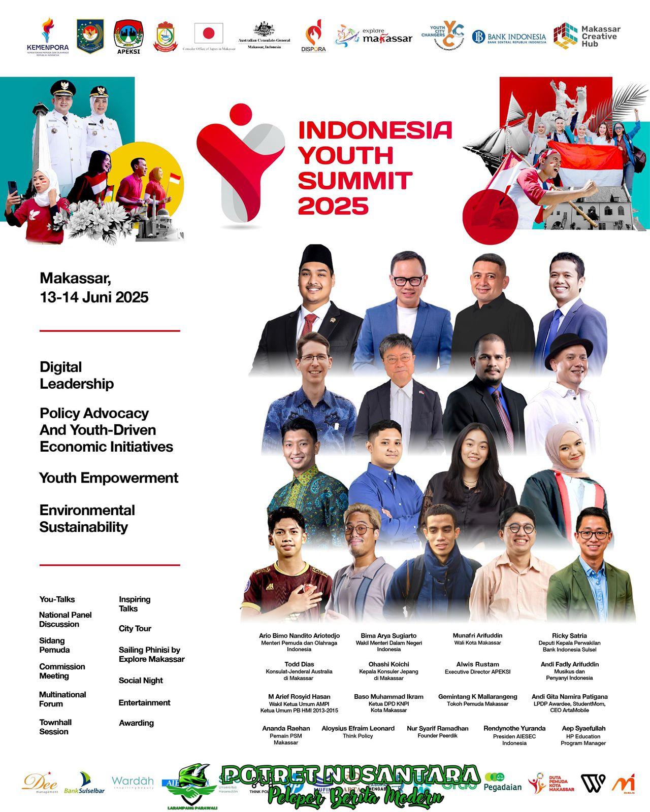 Makassar, Potretnusantara.co.id – Semangat muda, kolaborasi lintas negara, dan visi besar menuju Indonesia Emas 2045 berpadu dalam Indonesia Youth Summit (IYS) 2025 yang resmi dibuka di Lapangan Karebosi, Makassar, Jumat (13/6/2025). Mengusung tema “Gen Merah Putih, Pemuda Penggerak Perubahan Menuju Indonesia Emas 2045”, ajang ini menjadi ruang inspiratif bagi ratusan pemuda dari seluruh penjuru nusantara.