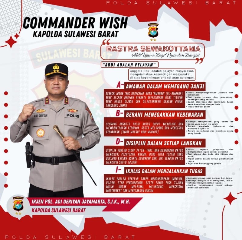 Irjen Adi Deriyan menekankan bahwa empat prinsip tersebut bukan sekadar slogan, tetapi harus diwujudkan dalam praktik nyata di lapangan. Commander Wish, lanjutnya, diharapkan menjadi pedoman kerja Polda Sulbar dan jajaran dalam meningkatkan kinerja, menumbuhkan kepercayaan publik, serta menghadirkan Polri yang profesional, humanis, dan berintegritas.
