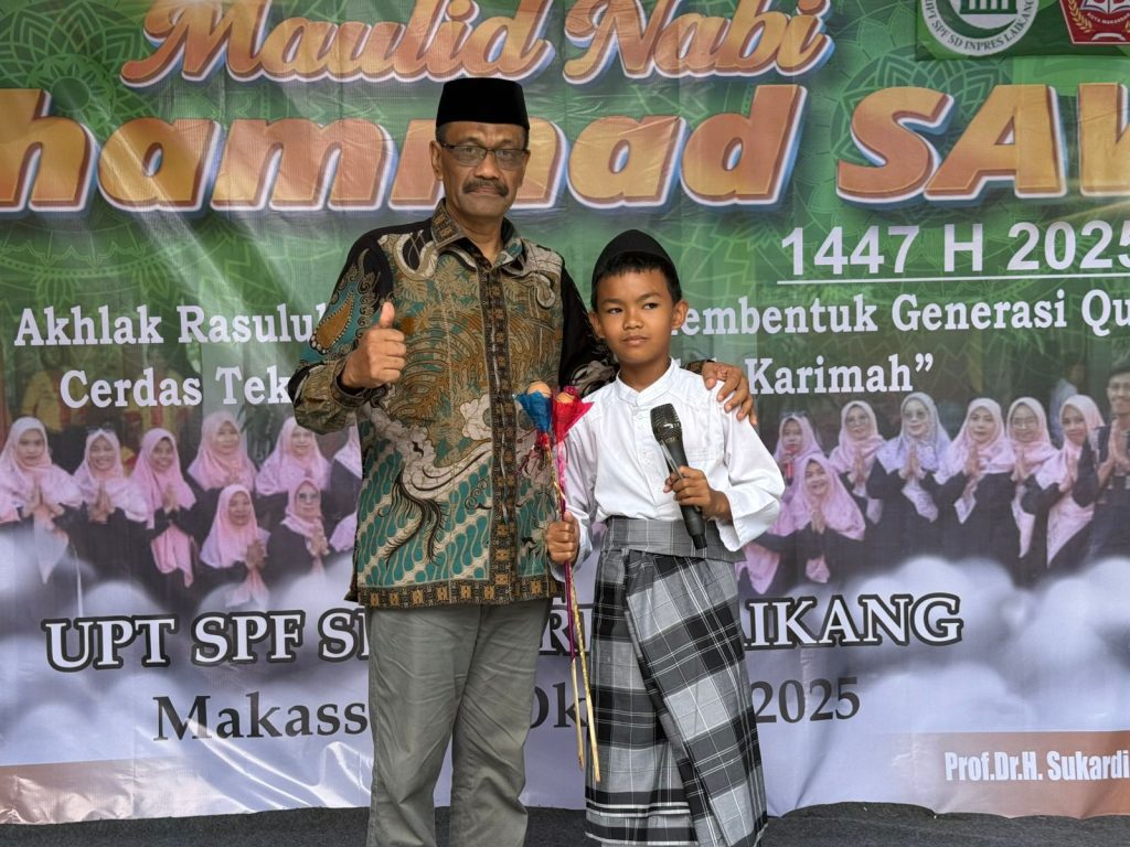 Makassar, Potretnusantara.co.id – UPT SPF SD Inpres Laikang menggelar peringatan Maulid Nabi Muhammad SAW di halaman sekolah, Sabtu (4/10/2025). Kegiatan ini mengusung tema “Meneladani Akhlak Rasulullah SAW untuk Membentuk Generasi Qur’ani, Cerdas Teknologi, dan Berakhlakul Karimah.”