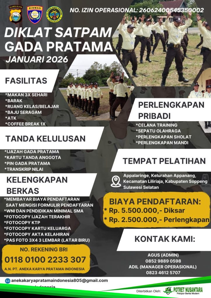 Soppeng, Potretnusantara.co.id – PT Aneka Karya Pratama Indonesia resmi membuka pendaftaran Pendidikan dan Pelatihan (Diklat) Satpam Gada Pratama yang akan berlangsung pada Januari 2026.