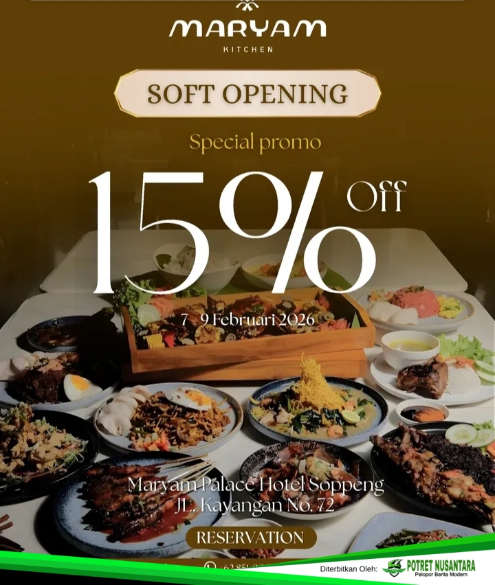 SOPPENG,Potretnusantara.co.id – Kabupaten Soppeng kembali menambah pilihan destinasi kuliner dengan hadirnya Maryam Kitchen Soppeng by Maryam Palace Hotel, yang resmi dibuka pada Jumat (7/2). Restoran ini menawarkan konsep kuliner keluarga dengan menu andalan seafood serta beragam hidangan khas bercita rasa Nusantara.