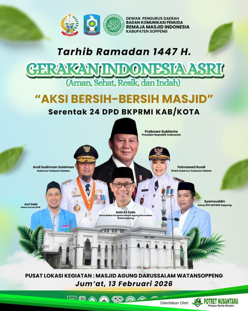 Soppeng, Potretnusantara.co.id- Pengurus dan kader Badan Komunikasi Pemuda Remaja Masjid Indonesia (BKPRMI) se-Sulawesi Selatan secara serentak melaksanakan aksi bersih-bersih masjid di masing-masing kabupaten/kota. Kegiatan ini merupakan bentuk partisipasi aktif dalam menyukseskan program yang dicanangkan Presiden Prabowo Subianto, yakni Indonesia ASRI (Aman, Sehat, Resik, dan Indah).