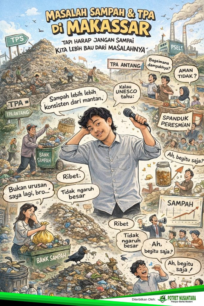 Opini Publik, Potretnusantara.co.id – Kalau ada yang bilang Makassar itu kota yang tidak pernah tidur, mungkin dia belum pernah lewat TPA Antang jam dua siang. Di sana, bukan cuma kota yang bangun sampahnya juga. Lengkap dengan aromanya yang… ya, katakanlah lebih jujur dari janji politik.