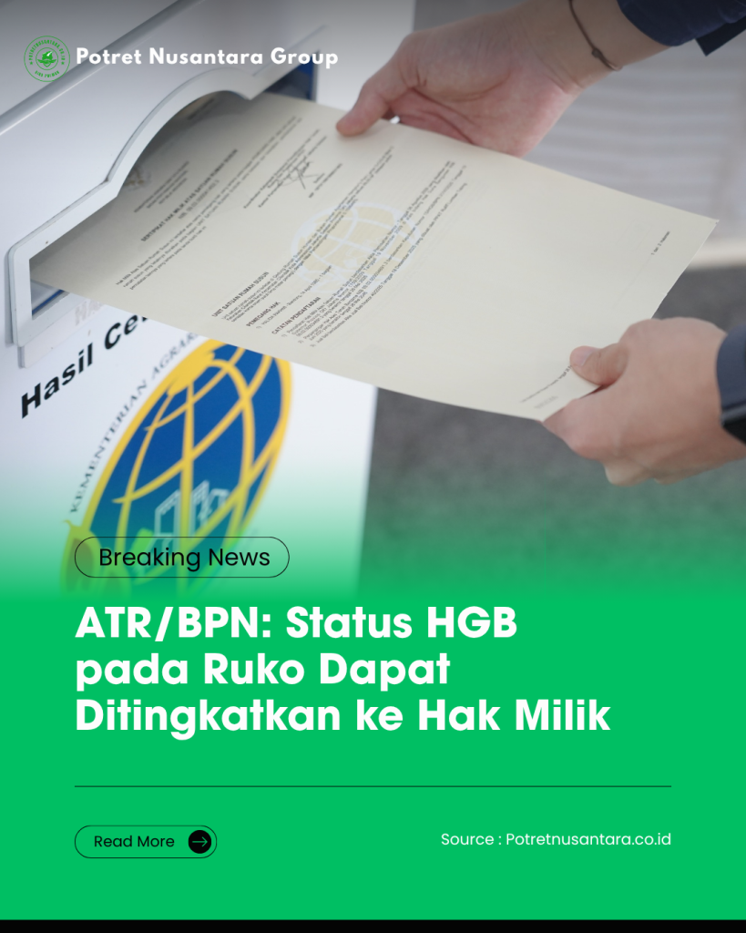 Jakarta, Potretnusantara.co.id – Pemilik rumah toko (ruko) dengan status Hak Guna Bangunan (HGB) memiliki peluang untuk meningkatkan status kepemilikan menjadi Hak Milik, sepanjang memenuhi persyaratan sesuai peraturan perundang-undangan.