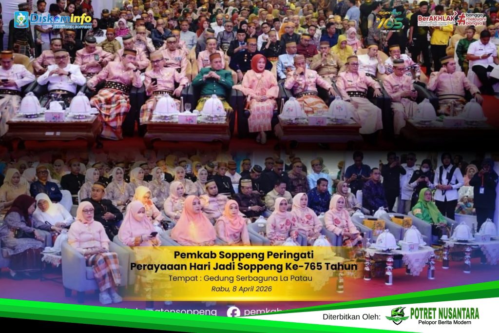 Soppeng, Potretnusantara.co.id – Pemerintah Kabupaten Soppeng menggelar perayaan Hari Jadi Soppeng ke-765 di Gedung Pertemuan La Patau, Watansoppeng, Rabu (8/4/2026).