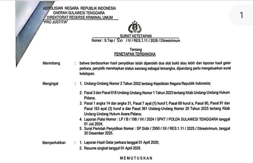 Penetapan tersangka dilakukan melalui mekanisme gelar perkara, sebagaimana tertuang dalam Surat Penetapan Tersangka Nomor: S.Tap/20/IV/RES.1.11/2026/Ditreskrimum tertanggal 9 April 2026.