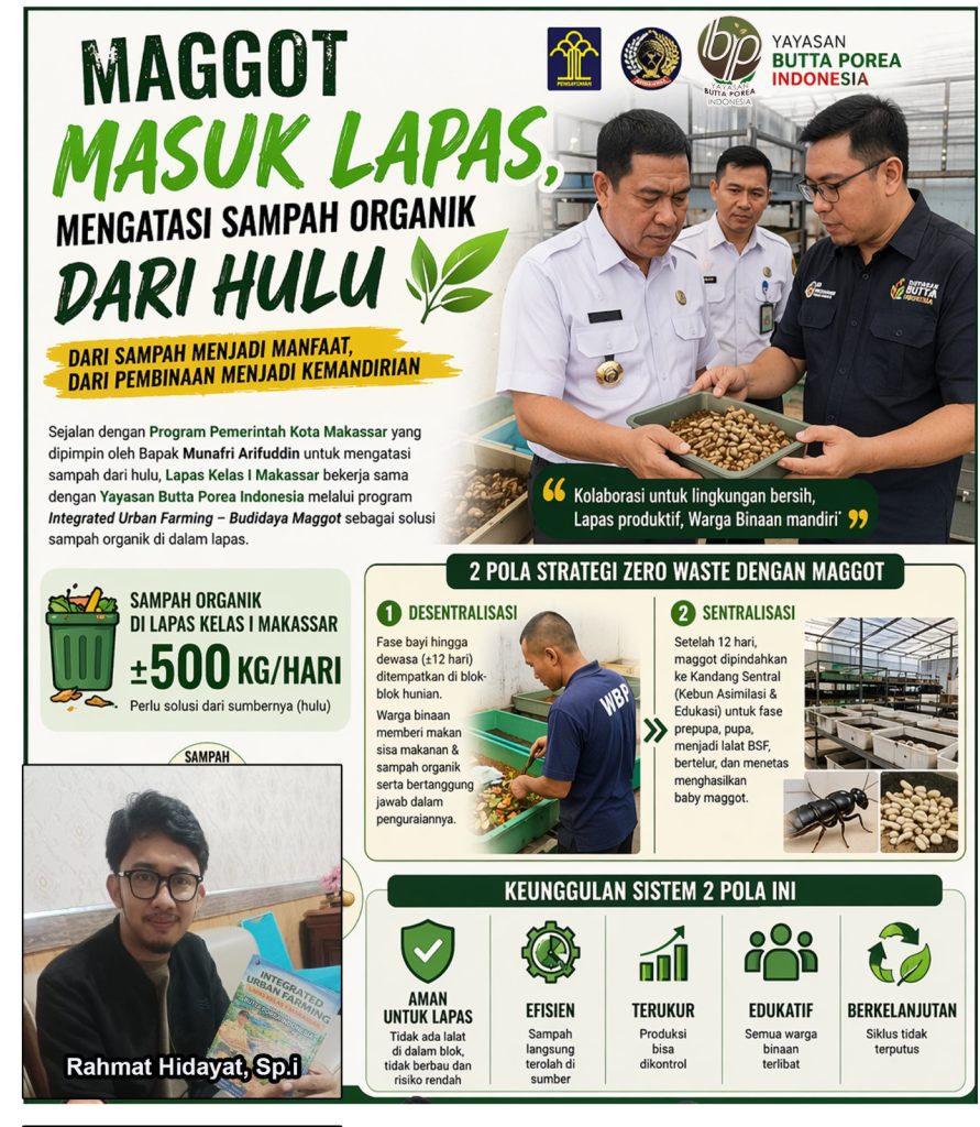 Salah satu langkah konkret diwujudkan melalui kolaborasi antara Yayasan Butta Porea Indonesia dan Lembaga Pemasyarakatan (Lapas) Kelas I Makassar dalam program Integrated Urban Farming, khususnya budidaya maggot sebagai solusi pengolahan sampah organik.