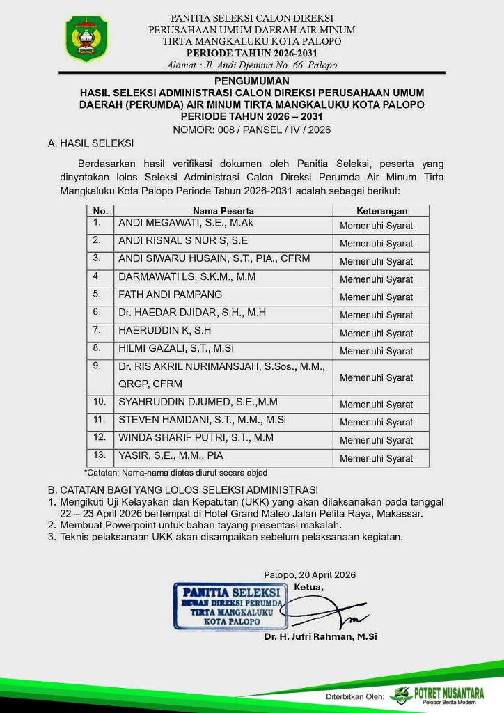 Palopo, Potretnusantara.co.id – Panitia Seleksi Calon Direksi Perusahaan Umum Daerah (Perumda) Air Minum Tirta Mangkaluku Kota Palopo resmi mengumumkan hasil seleksi administrasi untuk periode 2026–203, Senin (20/4/2026). Pengumuman bernomor 008/PANSEL/IV/2026 tersebut menetapkan sejumlah nama peserta yang dinyatakan memenuhi syarat dan berhak melanjutkan ke tahapan berikutnya.