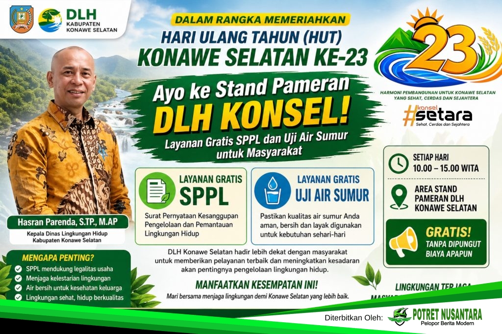 Konawe selatan, Potretnusantara.co.id – Dalam rangka memeriahkan Hari Ulang Tahun (HUT) Kabupaten Konawe Selatan (Konsel) ke-23, Dinas Lingkungan Hidup (DLH) Kabupaten Konawe Selatan menghadirkan layanan publik gratis bagi masyarakat melalui stand pameran yang dibuka selama rangkaian kegiatan pameran berlangsung.