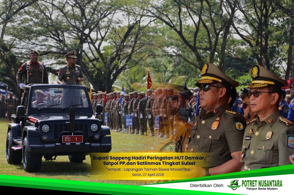 Luwu Utara, Potretnusantara.co.id – Bupati Soppeng, H. Suwardi Haseng, SE menghadiri Upacara Peringatan Hari Ulang Tahun ke-107 Pemadam Kebakaran dan Penyelamatan, ke-76 Satuan Polisi Pamong Praja (Satpol PP), serta ke-64 Satuan Perlindungan Masyarakat (Satlinmas) tingkat Provinsi Sulawesi Selatan yang digelar di Lapangan Taman Siswa Masamba, Kabupaten Luwu Utara, Senin (27/4/2026).